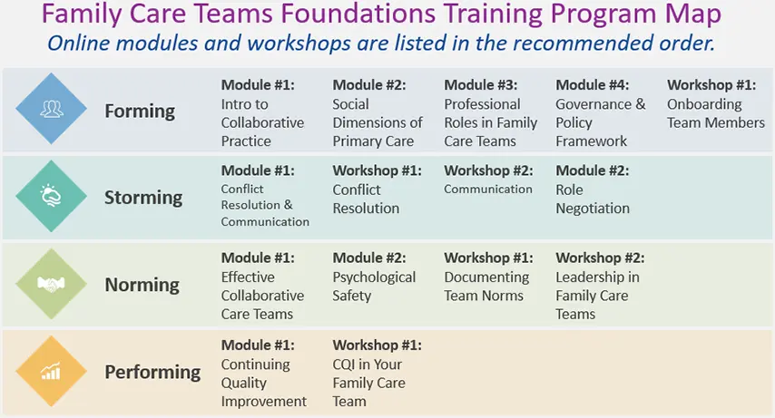 The recommended pathway through the Family Care Team Foundations program follows a staged model of team development. Every part of this training program will be designed with direct relevance to Family Care Team practice in mind.